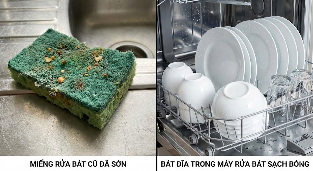 Nhiều người rửa tay rất kỹ nhưng lại chưa thật hoàn thiện ở bước cuối: lau khô bằng khăn hoặc để bát đĩa ráo nước trong môi trường ẩm. Khăn lau nếu không sạch tuyệt đối sẽ như một chiếc “cầu nối” đưa vi khuẩn quay lại bề mặt bát đĩa. Một số bài tổng hợp vi sinh cho thấy bát đĩa rửa máy thường có tải lượng vi khuẩn thấp hơn so với bát đĩa rửa tay, và sấy/ráo khô trong khoang máy góp phần quan trọng vào điều đó.