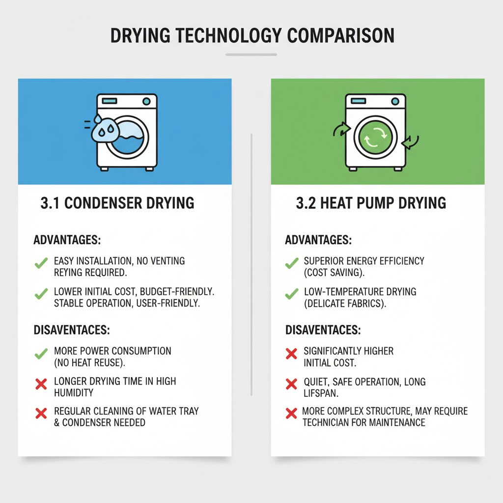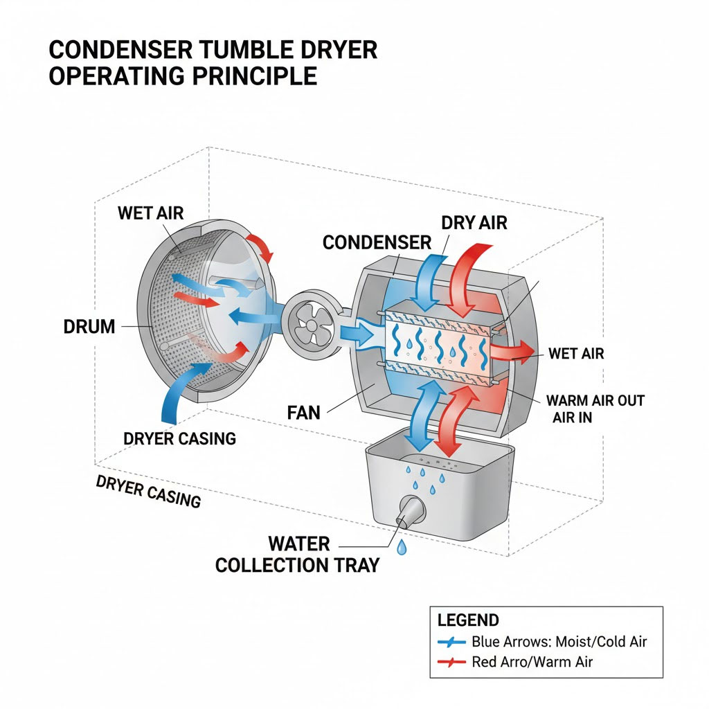 Công nghệ sấy ngưng tụ hoạt động theo cơ chế làm nóng không khí, đưa vào lồng sấy để làm bay hơi hơi nước trong quần áo. Hơi ẩm được dẫn vào bộ phận ngưng tụ, chuyển thành nước và thu vào khay chứa. Điểm đặc biệt: không cần ống thoát khí, nhờ đó phù hợp với các căn hộ diện tích nhỏ hoặc phòng giặt không có cửa thoáng.