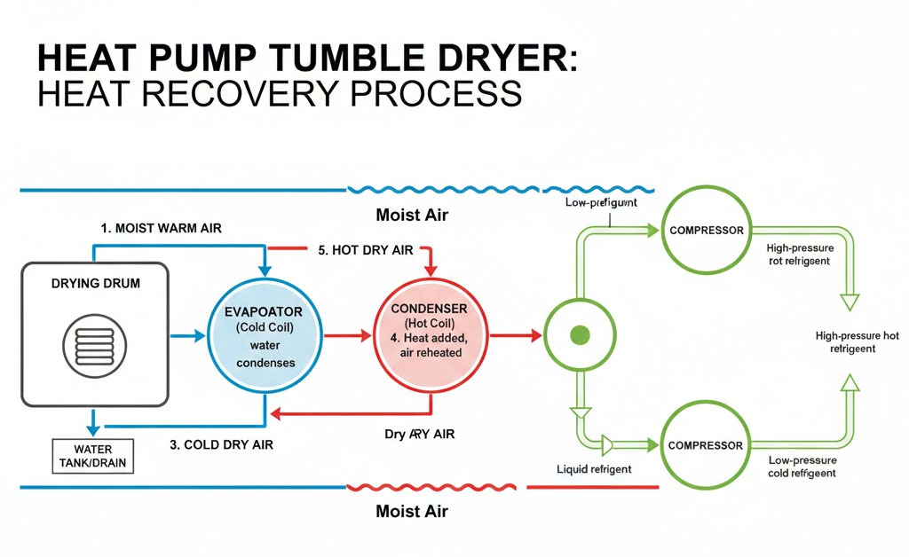 Công nghệ sấy bơm nhiệt tạo ra bước tiến trong ngành chăm sóc quần áo. Dựa trên nguyên lý tái sử dụng nhiệt, máy đưa luồng không khí nóng vào lồng sấy, sau đó thu về, làm mát, ngưng tụ hơi nước, rồi tái chế lại luồng khí nóng mới.
