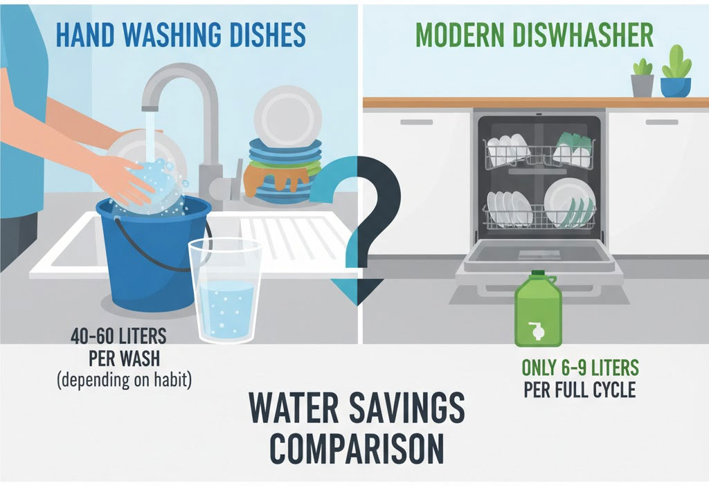 Đây là sự chênh lệch mang tính “cách mạng”. Một chiếc máy rửa chén có thể tiết kiệm tới 85% lượng nước so với rửa tay, điều mà không ai có thể làm thủ công.