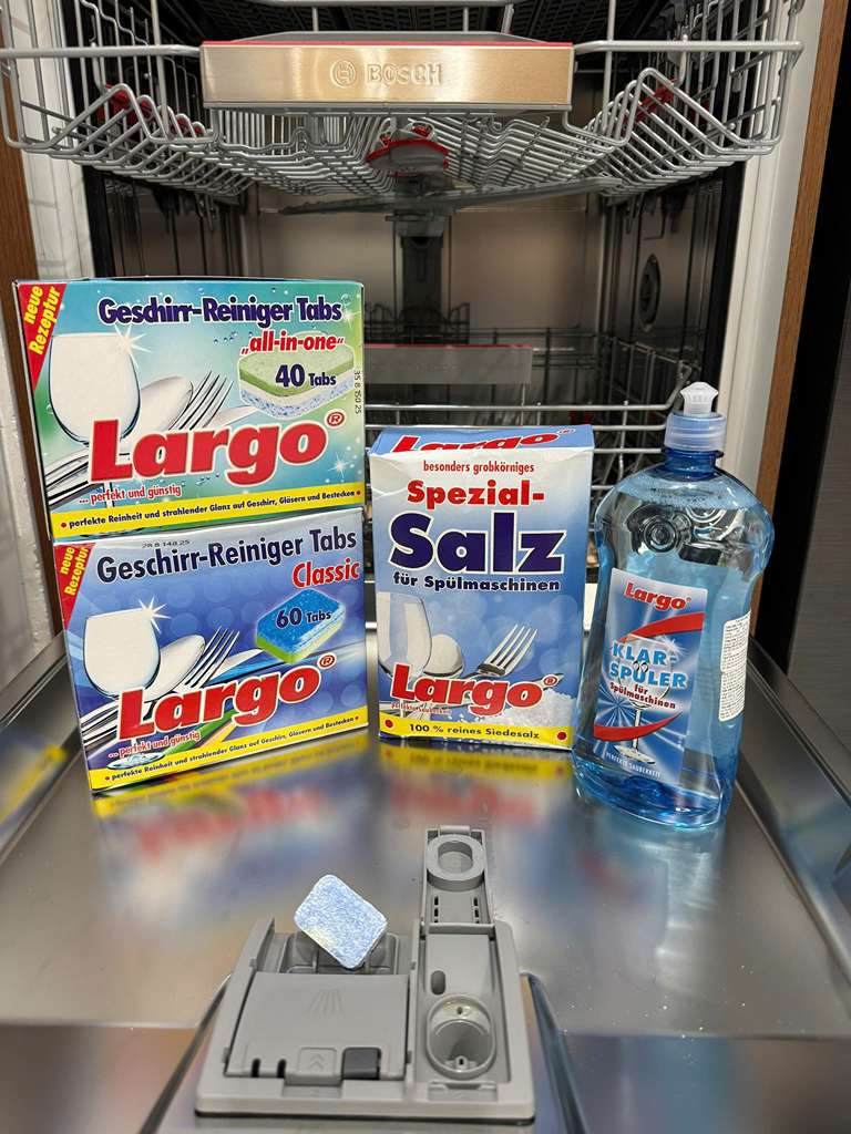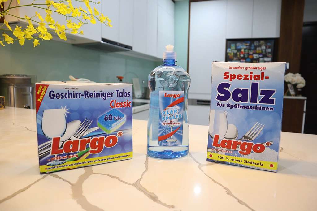 Nếu nước khu vực bạn ở là nước cứng (nhiều canxi/magiê), cặn vôi sẽ bám vào thanh nhiệt, tay phun và thành khoang máy. Muối chuyên dụng như muối rửa bát GlanzMeister hoặc Largo sẽ làm mềm nước, kéo dài tuổi thọ máy.