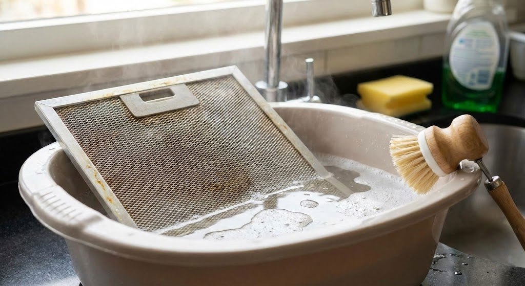 Tháo lưới lọc mỡ, ngâm nước ấm pha ít nước rửa chén 15 phút.