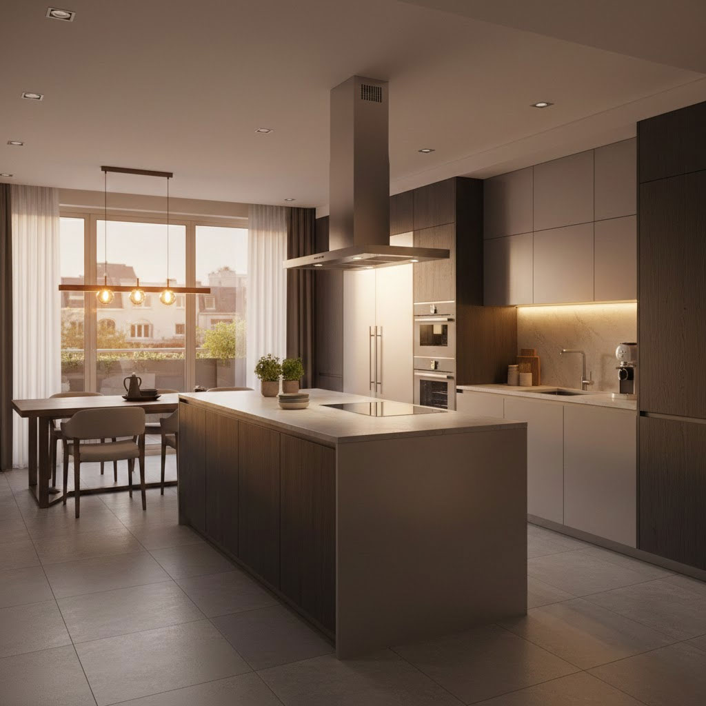 Máy hút mùi châu Âu thường dùng inox và hệ lọc nhiều lớp, tối ưu hút dầu mỡ và khử mùi, giúp không gian bếp luôn thoáng. Gia đình bận rộn nên chia vệ sinh theo tầng: