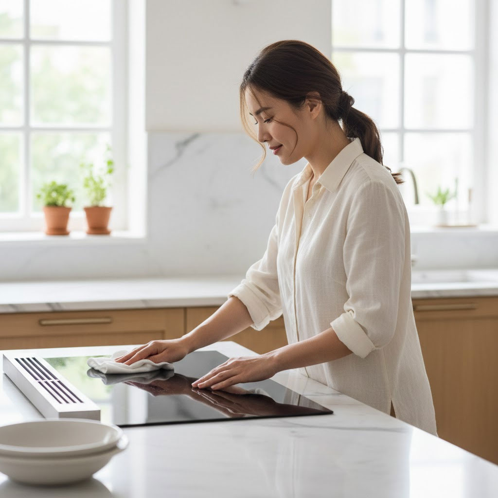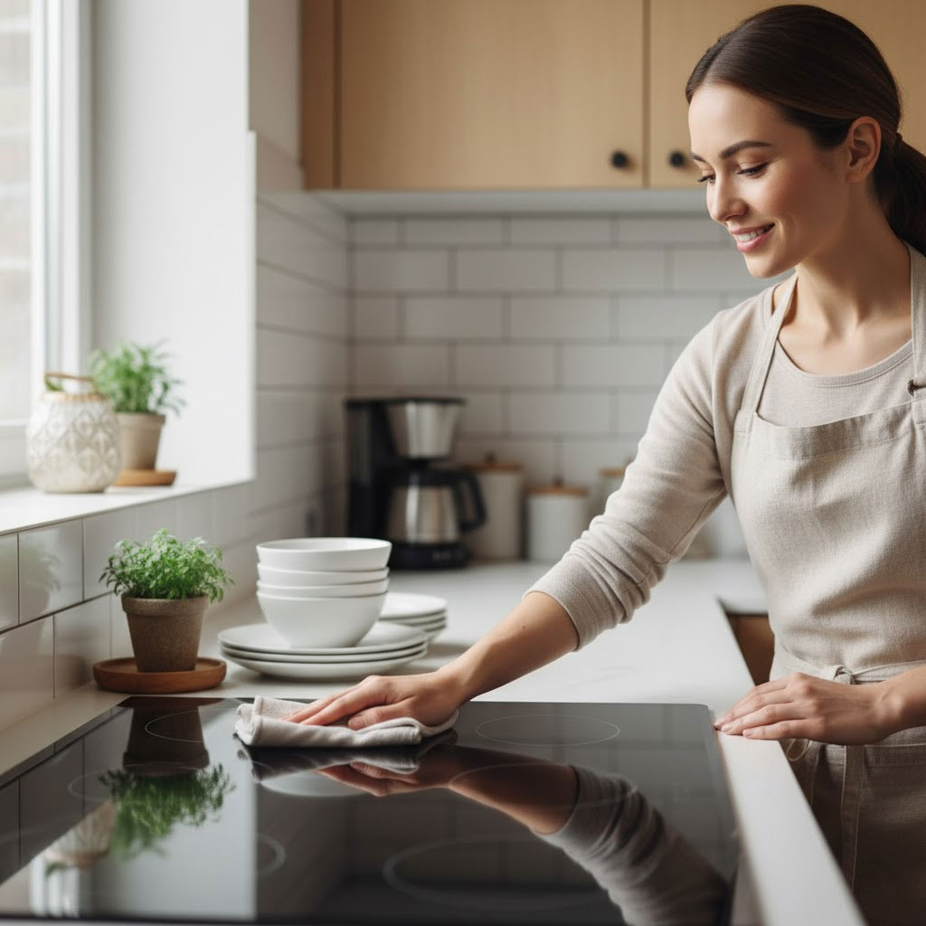 Lau mặt kính bếp bằng khăn microfiber sau mỗi lần nấu.