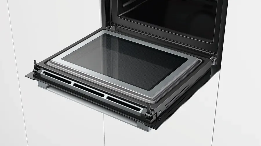 - Mặt trong của cửa lò nướng Bosch này được lắp kính thủy tinh, đảm bảo an toàn vì nhiệt độ cửa lò thấp (tối đa 40°C), đồng thời dễ lau chùi.