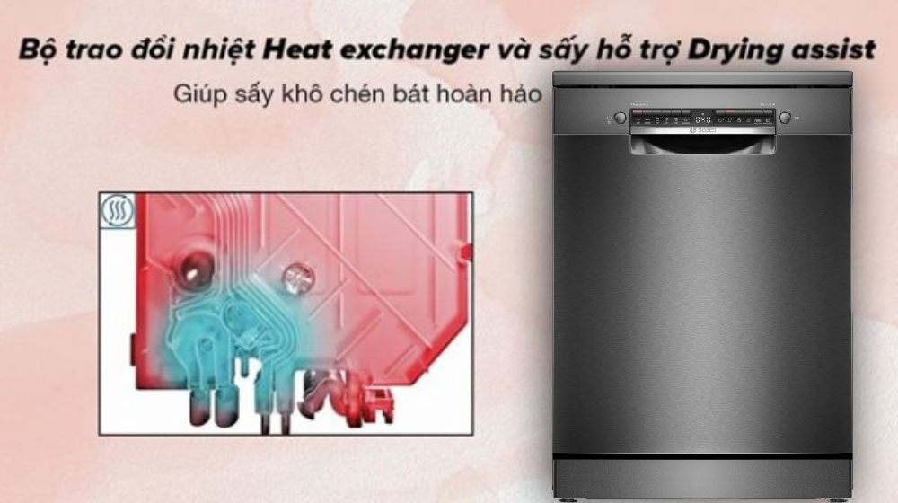 - Công nghệ Heat exchanger + Drying assist (nhiệt có sẵn + sấy hỗ trợ) sấy chén bát khô ráo, tránh tồn đọng nước bên trong gây ám mùi, tích tụ vi khuẩn.
