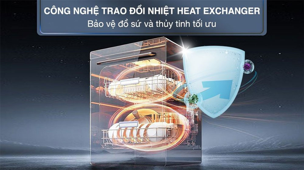 - Công nghệ sấy Heat Exchanger – Bộ trao đổi nhiệt : Đây là công nghệ sấy cơ bản nhất mà trên máy rửa bát Bosch nào cũng có, hơi nước nóng sau khi kết thúc chu trình rửa thì được đưa dẫn qua bộ trao đổi nhiệt để làm mát và lại dẫn ngược vào khoang máy, tạo thành vòng khép kín và hơi nước được từ từ bay đi.