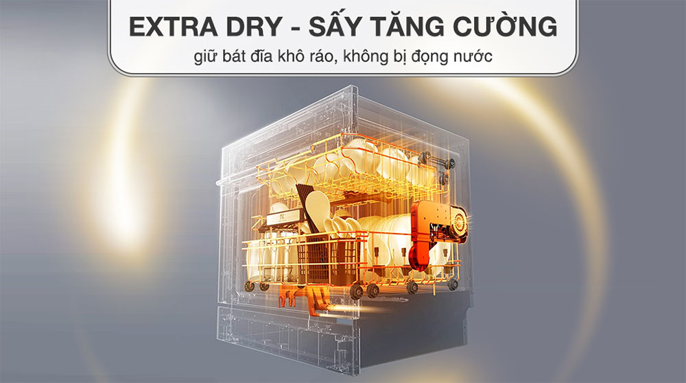 - Sấy tăng cường Extra Dry: Cho phép bạn tùy chỉnh nhiệt độ để tăng cường hiệu quả sấy khô chén bát, từ đó giảm bớt thao tác lau khô chén bát cho bạn trước khi bảo quản hoặc sử dụng.