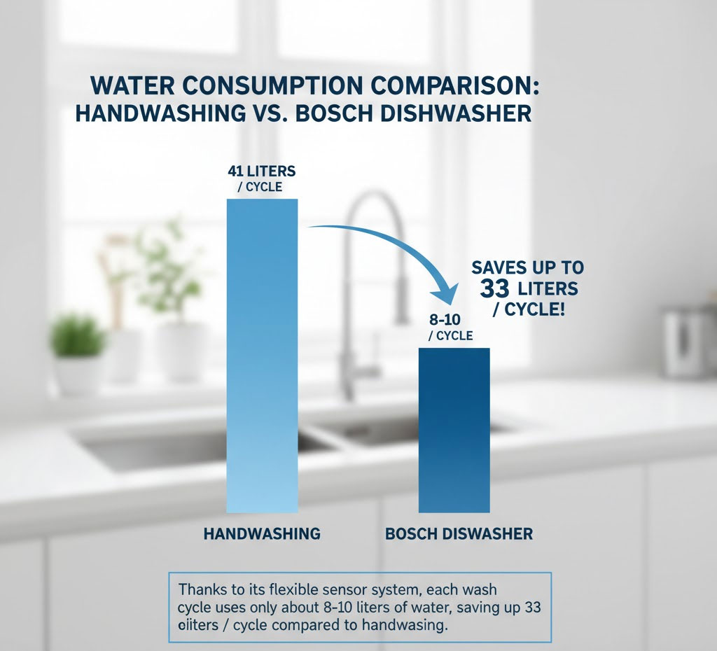 Nhiều người vẫn giữ quan niệm rằng máy rửa bát tiêu tốn nhiều nước hơn rửa thủ công. Nhưng thực tế hoàn toàn ngược lại. Máy rửa bát Bosch sở hữu tính năng Aqua Sensor và ActiveWater, giúp tự động cân chỉnh lượng nước dựa trên độ bẩn của bát đĩa.