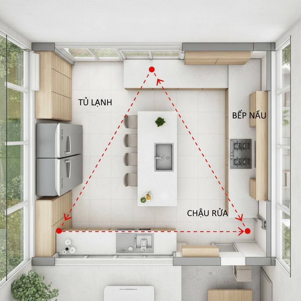 Tam giác vàng bếp, tủ lạnh, chậu rửa Theo nguyên tắc thiết kế bếp hiện đại, ba điểm quan trọng (bếp - tủ lạnh - chậu rửa) nên tạo thành tam giác với khoảng cách hợp lý, giúp quy trình nấu ăn thuận tiện đồng thời cân bằng lưu chuyển khí.