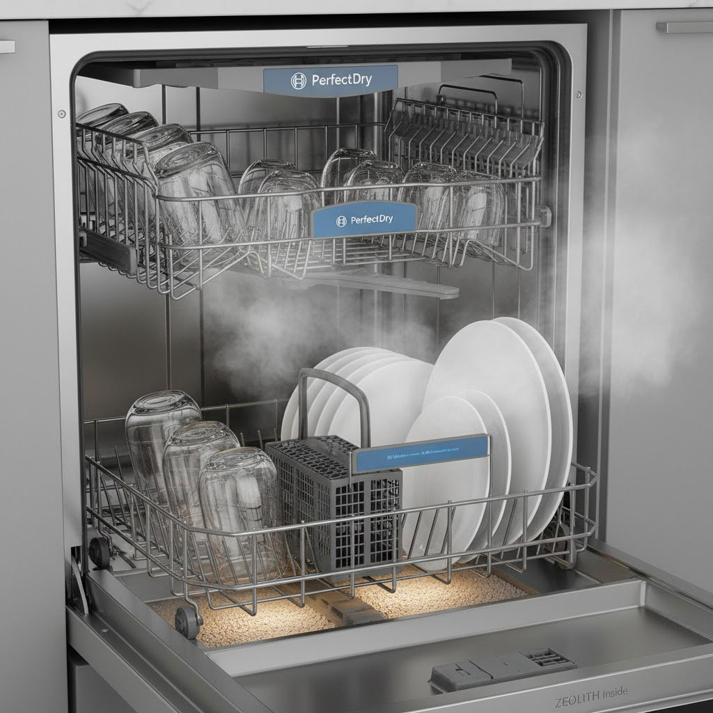 Một trong những điểm nhấn đáng tự hào của Serie 6 là công nghệ sấy PerfectDry, sử dụng khoáng chất Zeolith® độc quyền, giúp bát đĩa khô hoàn hảo ngay cả với đồ nhựa. Nhờ đó, người dùng có thể lấy chén bát ra sử dụng ngay sau khi máy kết thúc chu trình mà không cần lau lại.
