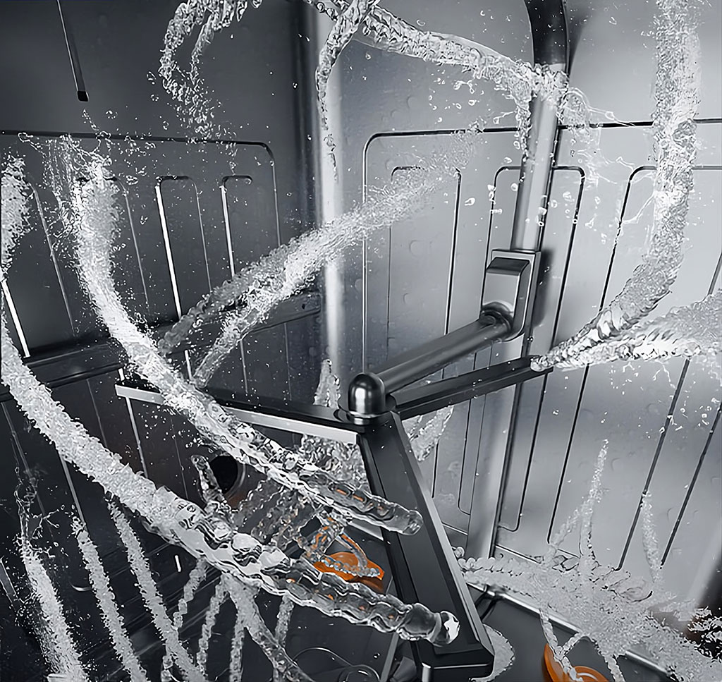 Điểm nổi bật là giỏ phía trên có vùng rửa siêu sạch, nhờ ba vòi phun xoay độc lập, tăng cường áp lực nước để làm sạch triệt để ngay cả các vật dụng dính dầu mỡ khó rửa.