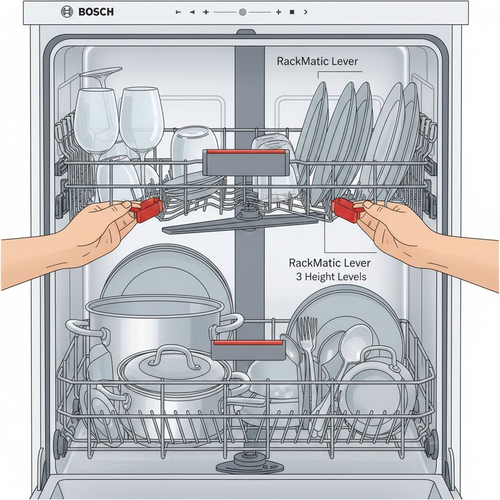 Không phải lúc nào lượng chén bát cũng giống nhau. Vì thế, Serie 6 trang bị hệ thống giỏ RackMatic, cho phép người dùng dễ dàng điều chỉnh độ cao của giỏ trên ngay cả khi đã đầy. Tính năng này đặc biệt hữu ích khi cần rửa những chiếc nồi lớn hay ly cao có chân dài.