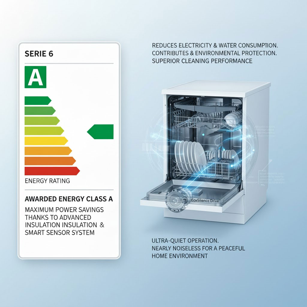 Serie 6 được đánh giá đạt mức năng lượng A, thể hiện khả năng tiết kiệm điện năng tối đa nhờ lớp cách nhiệt tiên tiến cùng hệ thống cảm biến thông minh. Công nghệ này không chỉ giảm lượng điện tiêu thụ mà còn tiết kiệm nước đến mức ấn tượng, giúp người dùng góp phần bảo vệ môi trường mà vẫn đảm bảo hiệu suất làm sạch vượt trội.